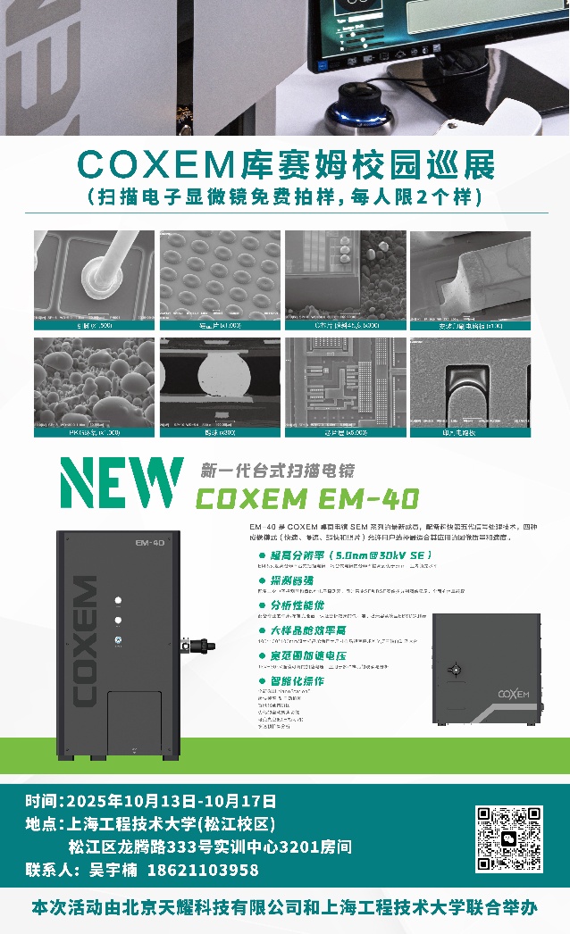 北京天耀科技有限公司与上海工程技术大学联合举办COXEM库塞姆扫描电镜分析分析使用体验巡展活动,由3522vip浦京集团官网承办,时间定于2025年10月13日至17日,为期一周,地点定于上海松江区龙腾路333号实训中心3201房间,每人可以免费体验2个样品的COXEM库塞姆扫描电镜分析(含喷金、能谱分析),欢迎各位老师届时参加。