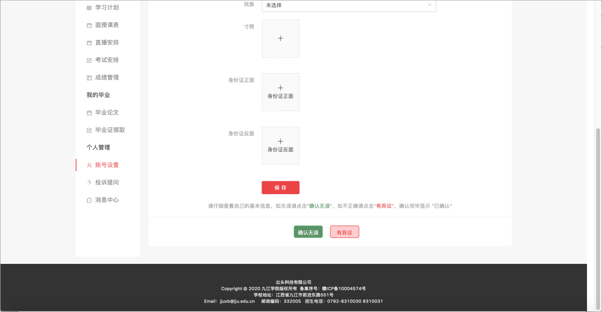 进入首页,首先各位同学确认个人信息无误,否则无法进行其它操作。完善后点【确认无误】